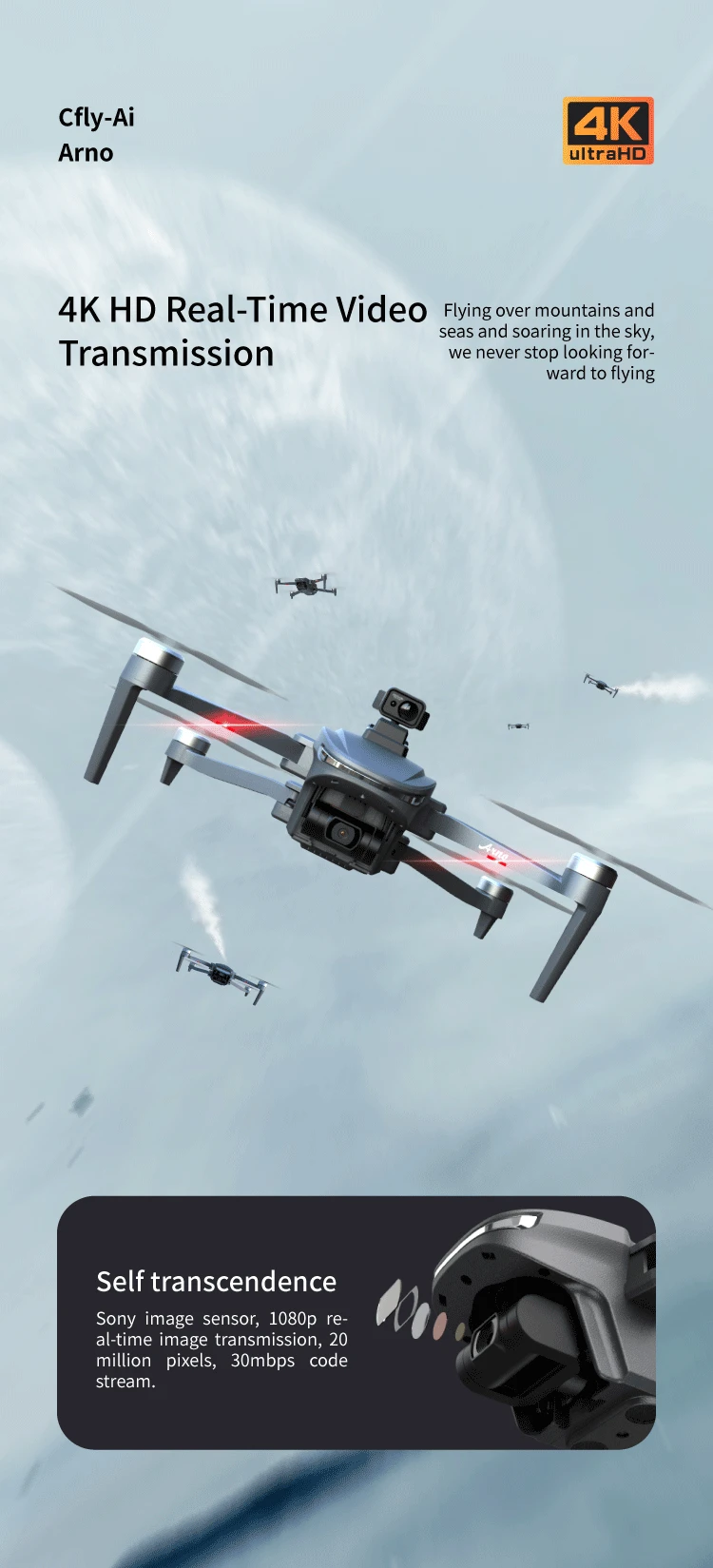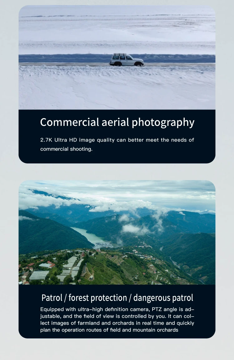 5 ) 2. Gimbal Kamera HD 7K. Ia dilengkapi dengan 2. Kamera 7K, ditala dengan hebat untuk menangkap gambar dan video dari langit, juga dengan gimbal tanpa berus tiga paksi, membantu dron merakam rakaman tanpa getaran.