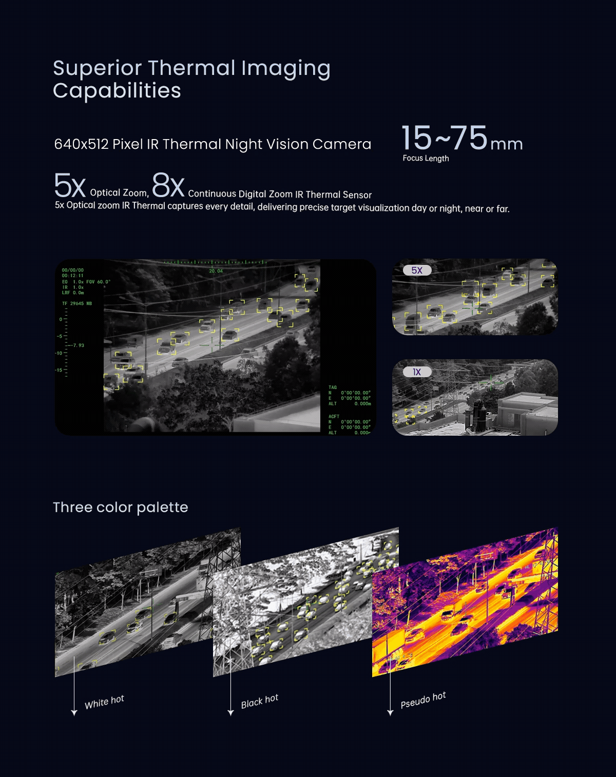 - IR-warmtebeeldcamera: 5x optische zoom met ongekoelde langgolvige infraroodtechnologie.