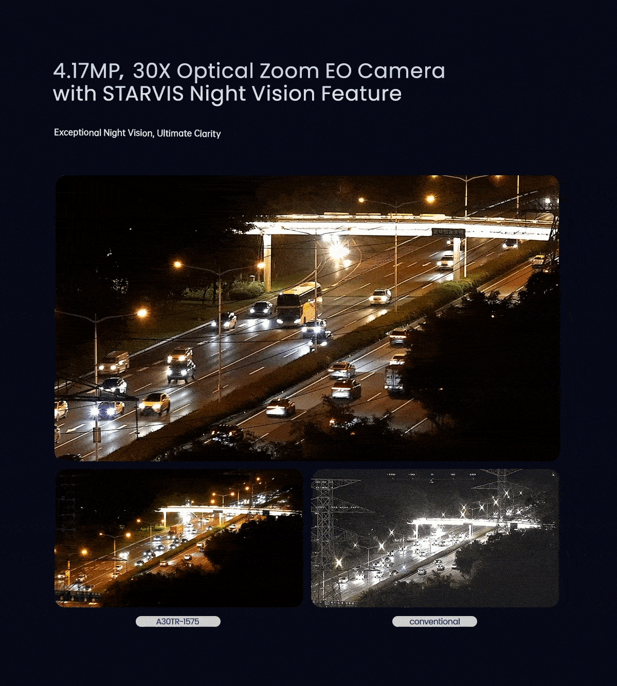 - EO-camera: 30x optische zoom starlightcamera met uitzonderlijke prestaties bij weinig licht.
