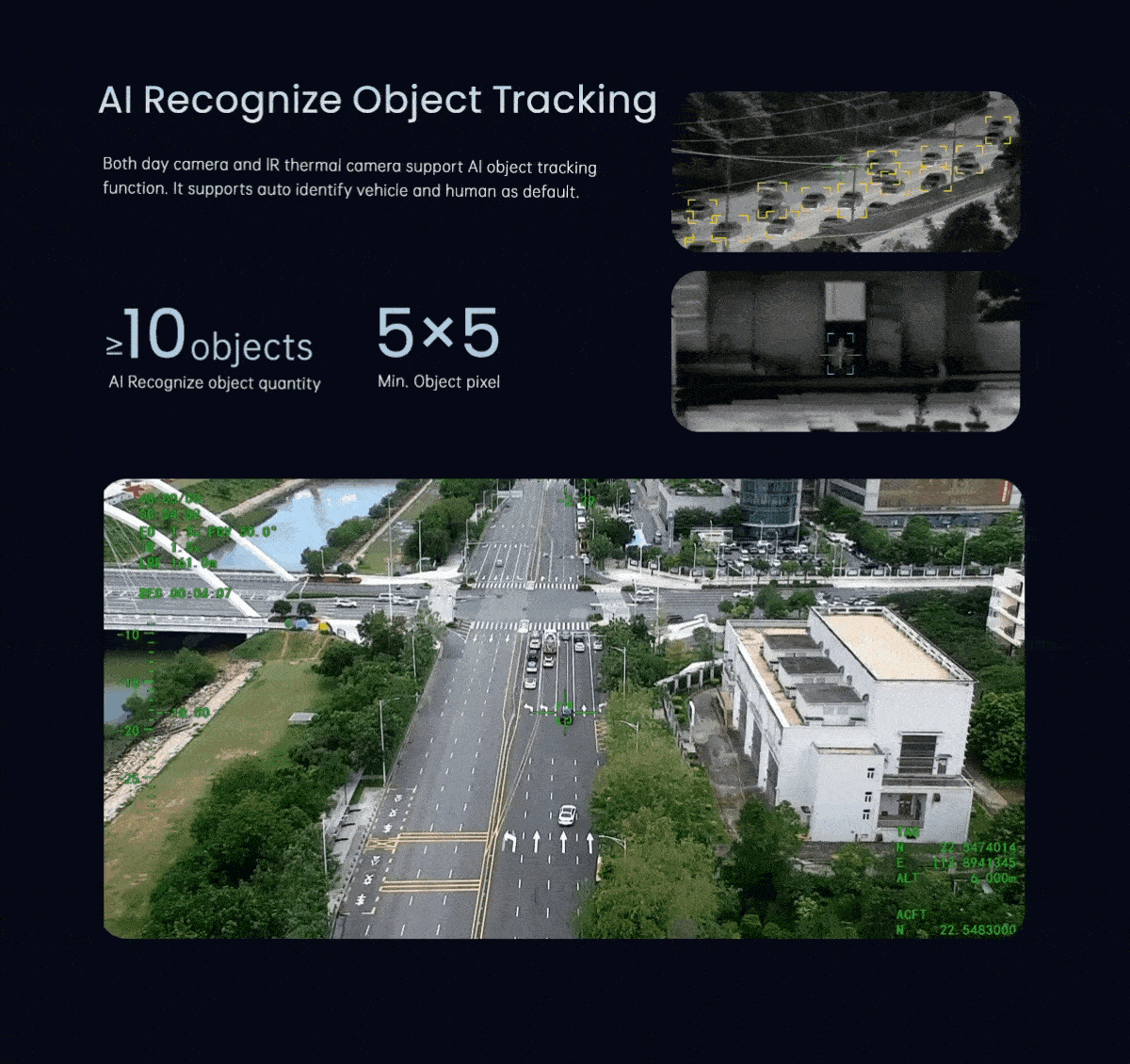 - Intelligente tracking:AI-algoritmen detecteren en volgen voertuigen en mensen tegelijkertijd.
