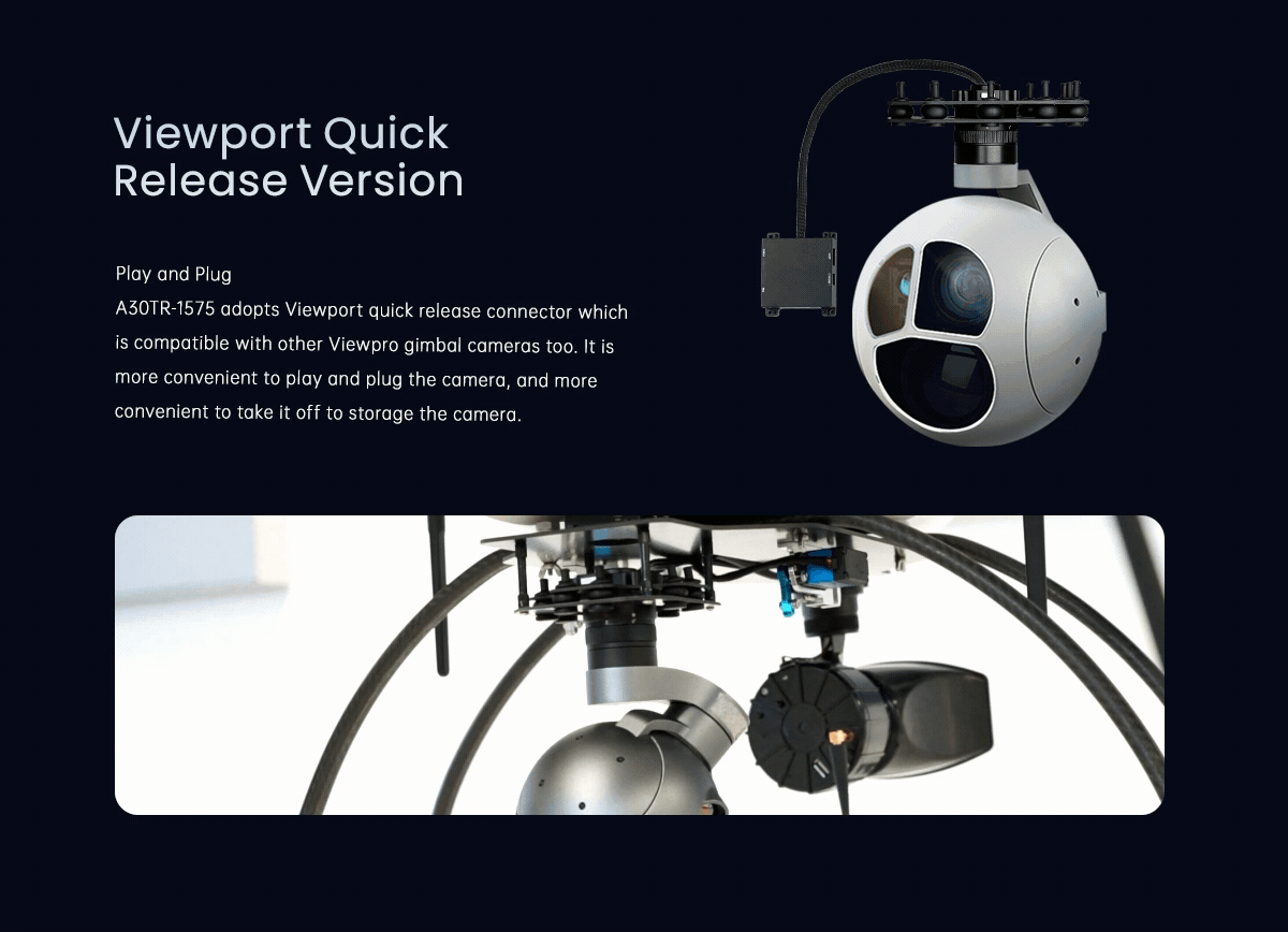 De ViewPro A30TR-1575 Triple Sensors Gimbal biedt stabiele beeldprestaties, een hoge betrouwbaarheid in omgevingen met hoge en lage temperaturen met snelle veranderingen en hoogwaardige thermische vensters.