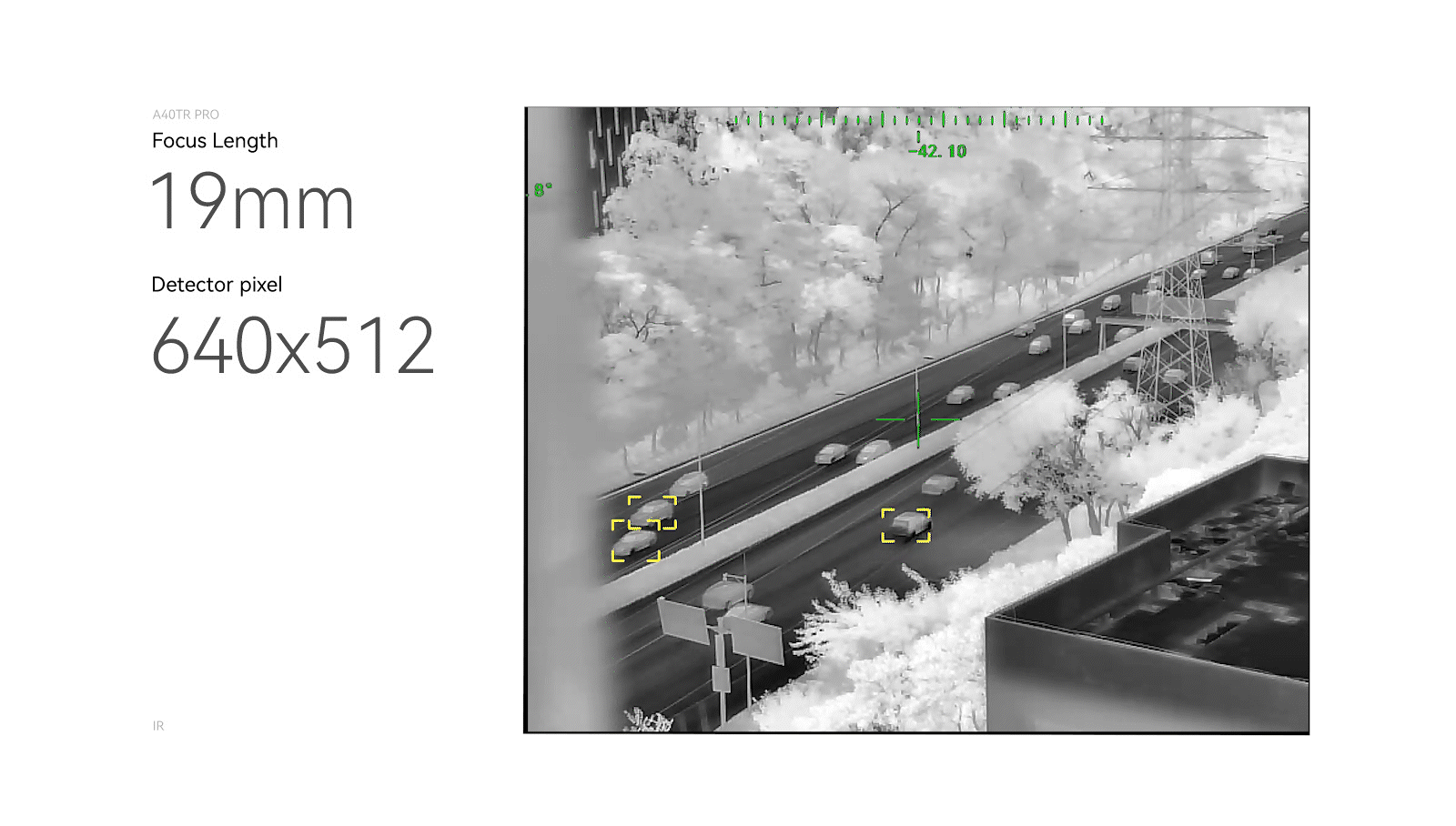 - Thermische beeldvorming: 640x512 ongekoelde warmtebeeldcamera met een detectiebereik tot 2.428m voor voertuigen en 792m voor mensen.