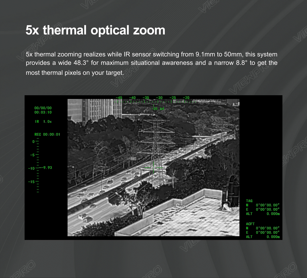 De ViewPro AT9-50 is een geavanceerde dual thermal drone gimbal camera, met een 5x thermische optische zoom, dual field of view (9.1mm en 50mm), en 640x512 IR resolutie. Ontworpen voor precisie, combineert het geavanceerde thermische beeldvorming met AI-aangedreven mens- en voertuigvolgmogelijkheden. De robuuste CNC-gefreesde aluminium behuizing zorgt voor duurzaamheid, terwijl het brede ingangsspanningsbereik (14.8V–25.2V) en de operationele temperatuurtolerantie (-20℃ tot +50℃) het geschikt maken voor veeleisende toepassingen zoals openbare veiligheid, inspectie van faciliteiten en zoek- en reddingsmissies.