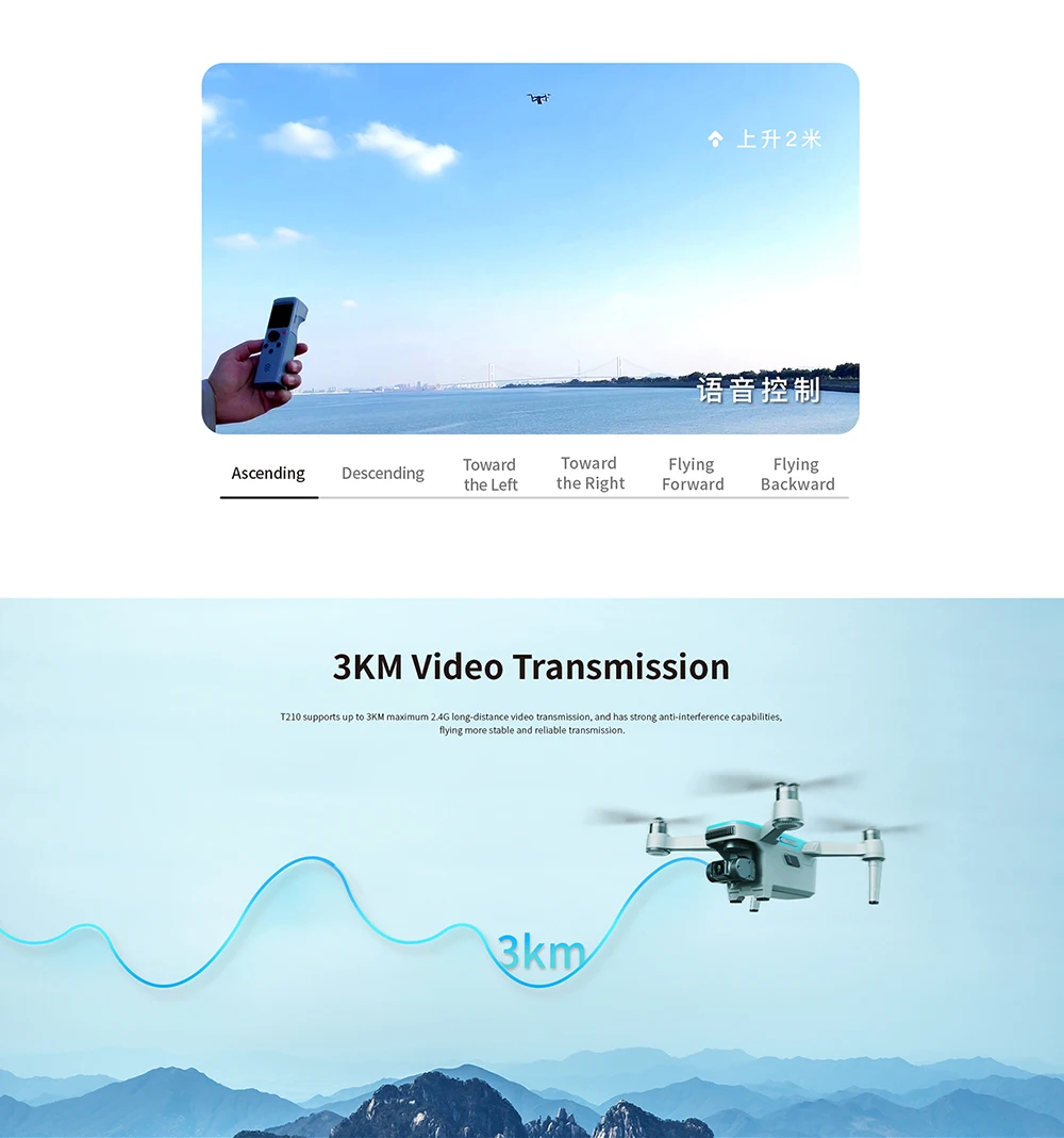 Kenmerken: 1. 4K-drone met camera: T210-drones met camera voor volwassenen 4K professionele lange afstand ondersteunt 4K-opnamen en H. 264-coderingsformaat uitvoer, en behoudt de meest realistische details. De RC-drones met camera hebben een groothoeklens van 85 ° met ultralage vervorming en maken je creatie meer geïnspireerd. Met time-lapse-fotografie is het materiaal voor luchtfotografie rijker en zijn de foto's mooier. 2. Drone met lange vliegtijd: de T210 heeft een lichtgewicht rompontwerp en is uitgerust met een 2200 mAh intelligente batterij met hoge capaciteit, de maximale vliegtijd is tot 31 minuten(onbelaste toestand, zwevende vlucht op zeeniveau zonder wind).
