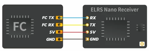Połączenie między odbiornikiem ELRS Nano a płytą FC pokazano poniżej.