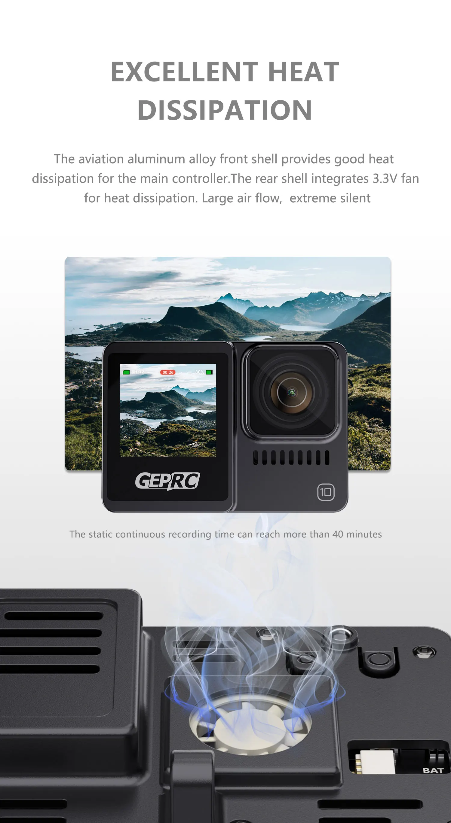 Przeprojektowany moduł BEC dodaje napięcie wyjściowe 3,3 V do zasilania wentylatora chłodzącego. Dobre odprowadzanie ciepła pozwala Naked Camera pracować i nagrywać przez długi czas. Moduł BEC jest podłączony do płyty głównej za pomocą niezawodnego i stabilnego elastycznego połączenia kablowego FPC, które może lepiej zapobiegać problemom ze słabym kontaktem.