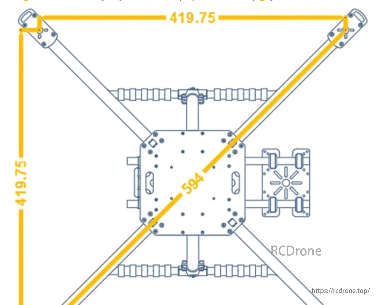 Rama MARK4 3K FPV ma podwozie typu Z, 419,75 mm x 419,75 mm, rozstaw osi 594 mm, waga 542,41 g. Zawiera płyty o grubości 2 mm, wysokość wewnętrzną 25 mm, wysokość podstawki 213,54 mm i otwory montażowe silnika o wymiarach 16 x 16 mm i 19 x 19 mm.
