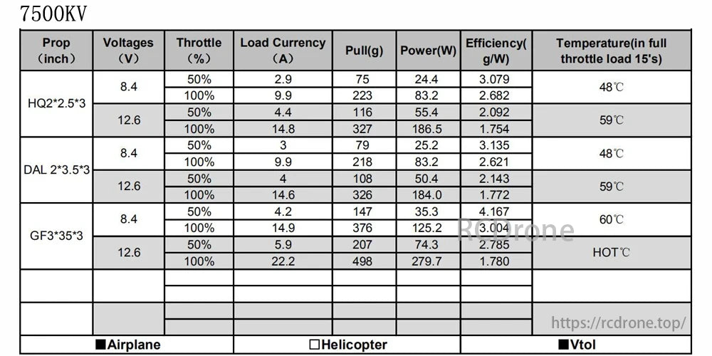 7500KV motor data for HQ2, DAL, GF props at 8.4V/12.6V: throttle, current, pull, power, efficiency, temperature insights across conditions.