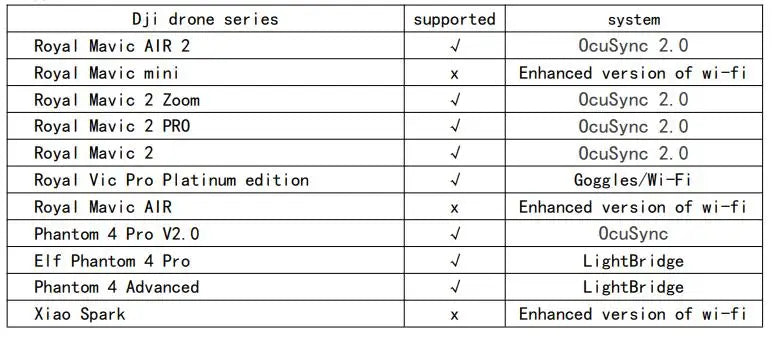 The following are the supported DJI drone models, while the statistics of other brands are not made. The LG-530 supports both 2.4 GHz and 5.8 GHz frequency bands, WIFI system drone is not supported.