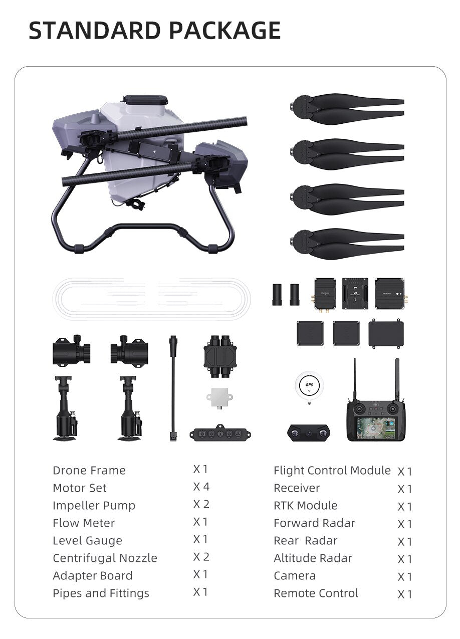 The flight controller system adopts group modular design, convenient to install without cumbersome wiring.With ultrasonic flow-meter, high precision weighing module and other parts,you can get the real-time disply of remaining liquid information. Original creation of water-cooled centrifugal nozzle effectively reduce the working temperature, extend the working life. The waterproof level of the whole drone reaches IP67, the EFT Z30 and Z50 can be widely used in various fields.