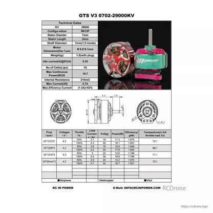 GTS V3 0702-29000KV specs: KV 29000, 9N12P, 7mm stator, 2mm length. Weighs 1.5g, max power 19.7W at 3S, efficiency >82% for RC models.