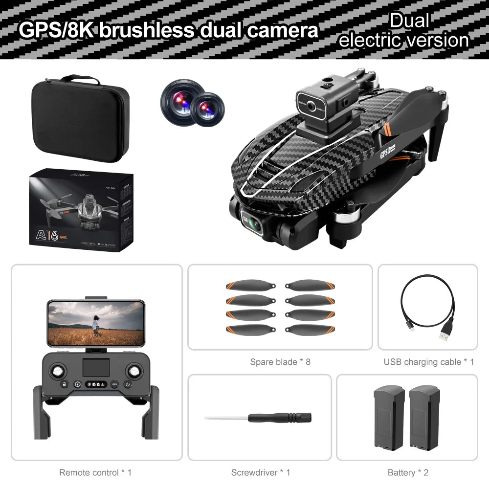 The A16 PRO Drone features an 88-degree GPS-enabled drone with an 8K electric tuning lens, allowing for precise remote control (up to 90 degrees) and high-definition optical flow capabilities. The HD camera provides stunning visuals, while the advanced lens technology ensures optimal image quality.