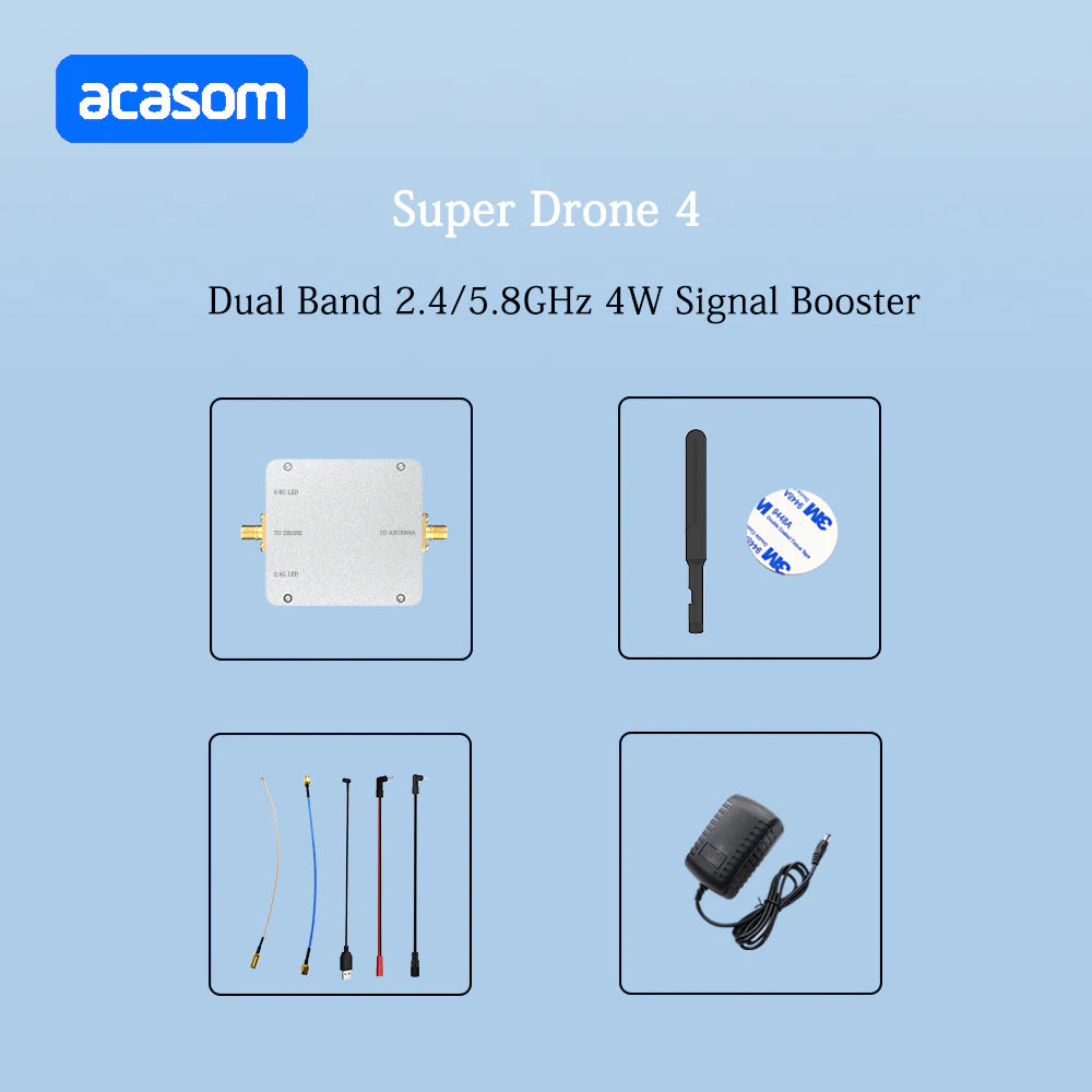 The ACASOM 2.4G & 5.8G 4W Dual Band Signal Booster is a versatile and powerful solution for users needing reliable signal extension across two popular frequency bands. With its high output, durability, and plug-and-play design, it is perfect for both professional FPV drone operators and users looking to extend wireless network coverage. For customization and wholesale inquiries, please contact support@rcdrone.top.