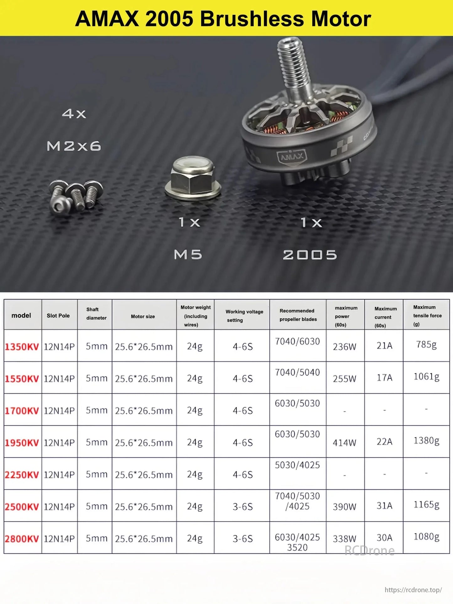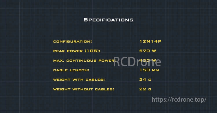 AMAX 2005 motor specs: 12N14P, 570W peak power, 450W continuous, 150mm cable, 24g with cables, 22g without.