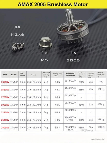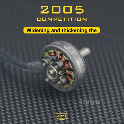 The AMAX 2005 Competition Brushless Motor series is engineered for top-tier FPV performance, offering unmatched durability, torque, and flight control. With a wide KV range from 1350KV to 2800KV, these motors support 3-6S LiPo setups and are perfect for freestyle, racing drones, cinewhoops, and fixed-wing aircraft. Built with AMAX-Lock-Bell technology, military-grade windings, and Japanese bearings, this motor is designed for pilots who demand reliability and peak performance.
