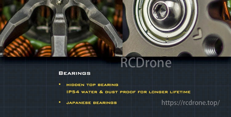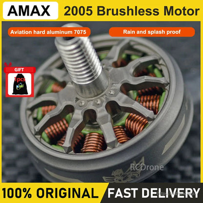 AMAX 2005 motor: shock-resistant, no parting bell, low-profile design, 7075 aluminum, dynamic balance, rainproof, integrated bearing protection, reliable rubber ring/washer for safety.