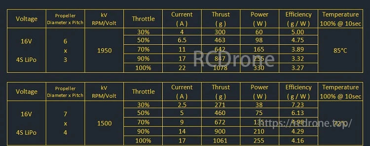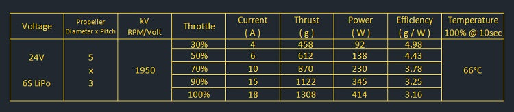 | 1950KV | 5mm | 4–6S | 24g | 414W | 22A | 1380g | 6030 / 5030 |