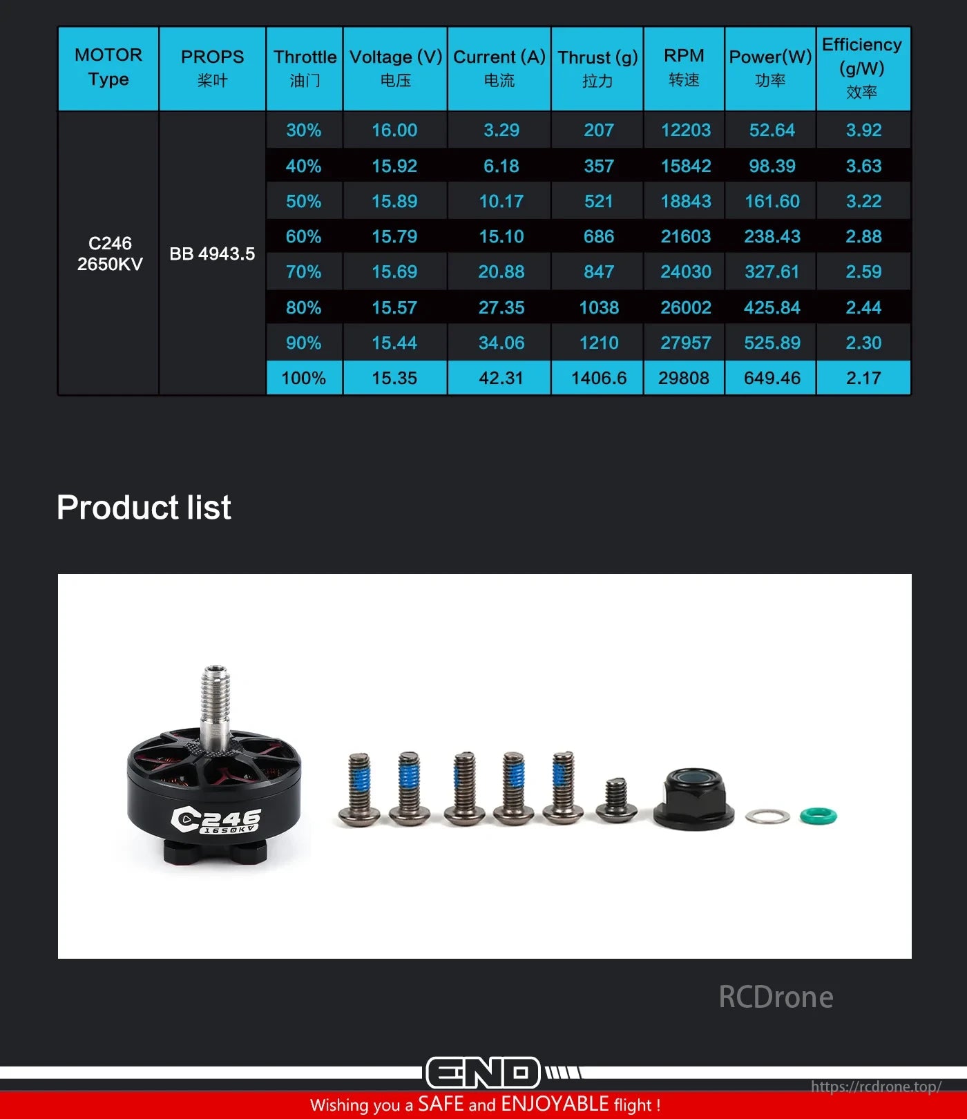 C246 2650KV brushless motor specs: voltage, current, thrust, RPM, power, efficiency at various throttle levels. Product list includes motor, screws, and accessories for safe, enjoyable flight.
