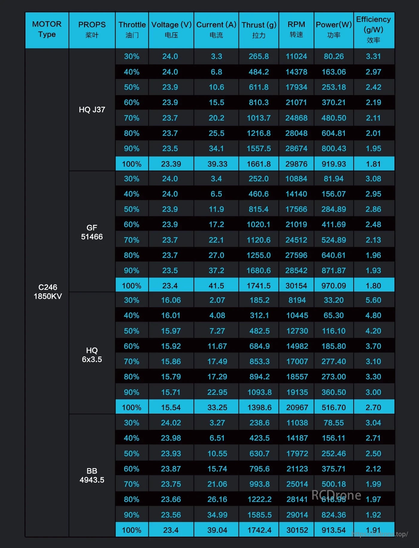 C246 1850KV motor performance data for HQ J37, GF 51466, HQ 6x3.5, and BB 4943.5 props at various throttle percentages, including voltage, current, thrust, RPM, power, and efficiency metrics.