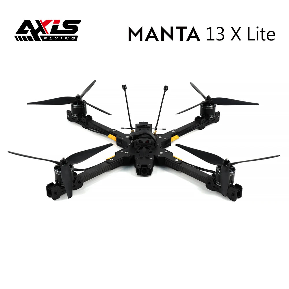 Introducing the Axisflying Manta 13 X Lite, a custom-built FPV drone designed for long-range flights with heavy payloads. This powerful machine features a 13-inch propeller, a DJI O3 VTX module, and a robust Argus 80A ESC paired with an F722 flight controller. The BosLi 800mAh 95C battery provides a reliable source of power, while the 5.86-inch Axisflying 3W props deliver impressive thrust. With a sturdy structure and a wheelbase of 600mm, this drone is built for stability and durability. The motor install hole is designed to accommodate an M4x30mm screw, and the bottom-to-top distance measures just 20mm. Whether you're flying for recreation or competition, the Axisflying Manta 13 X Lite is sure to provide a SAFE and ENJOYABLE flight experience.
