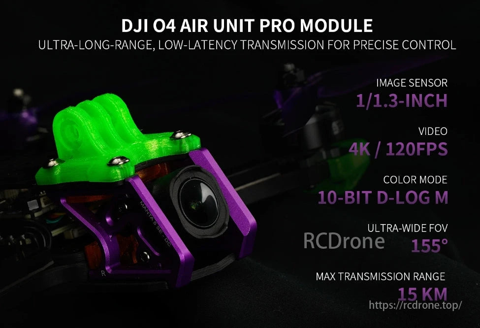 DJI O4 Pro Air Unit: Equipped with a 1/1.3” image sensor, 4K/120FPS video, 155° ultra-wide FOV, and up to 15km transmission range.