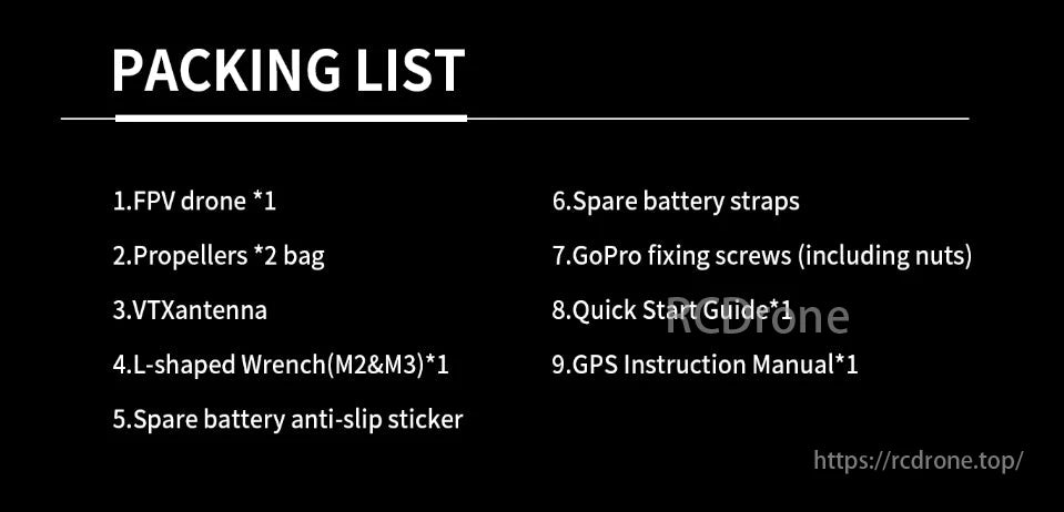 Packing List: FPV Drone, Spare Battery Straps, Propellers (2), VTX Antenna, L-Shaped Wrench (M2 and M3), Quick Start Guide, GPS Instruction Manual.