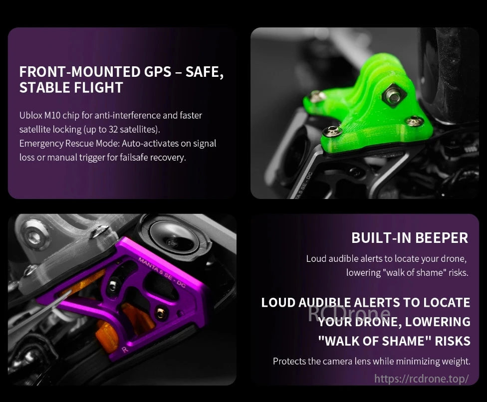 Front-Mounted GPS Safe for Stable Flight with Ublox M1O chip for anti-interference and fast satellite locking. It features Emergency Rescue Mode, auto-activating on signal or manual trigger for failsafe recovery. The device also includes Built-in Beepers for loud audible alerts to locate your drone, reducing "walk of shame" risks while protecting the camera lens and minimizing weight loss.