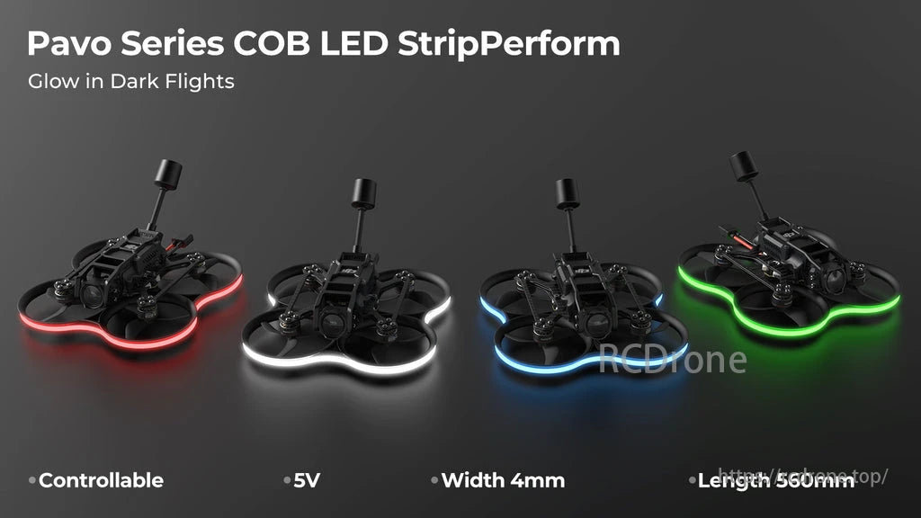 Pavo Series COB LED strip with glow-in-dark flight display features 5V power, 4mm width, and 560mm length for flexible use.