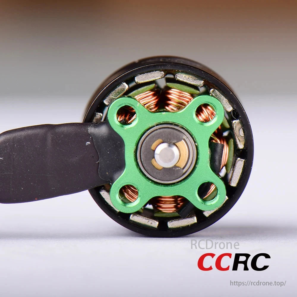 N52H strong magnet, NSK bearing, 7075 aluminum bell. KV4500 and KV6500 versions for 6S use. Compact design with green accents in CCRC S1106 Brushless Motor.