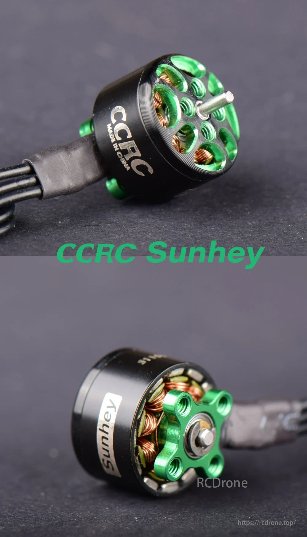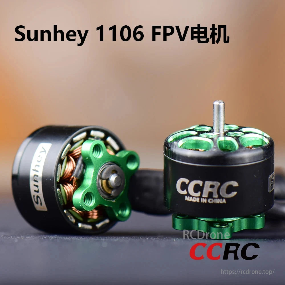 Sunhey CCRC S1106 FPV motor, 2023 series. Black body, green stator. High performance for FPV. Parameters below.