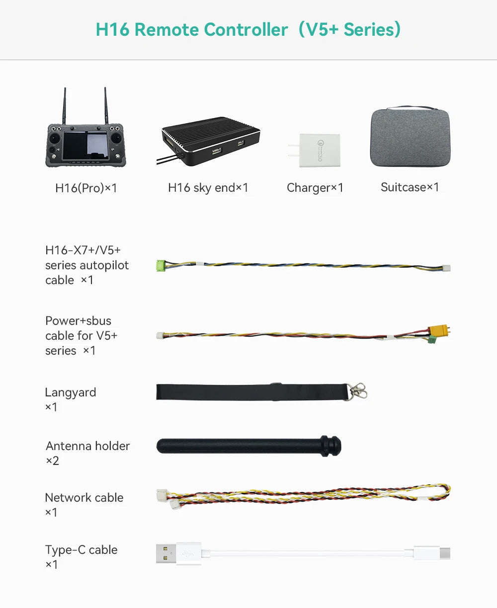 The package includes: * Autopilot cable for H16-X7+/VS+ series * H16 Sky End x1 * Charger x1 * Suitcase x1 * Power+Sbus cable x2 * Langyard antenna holder x1 * Type-C connector