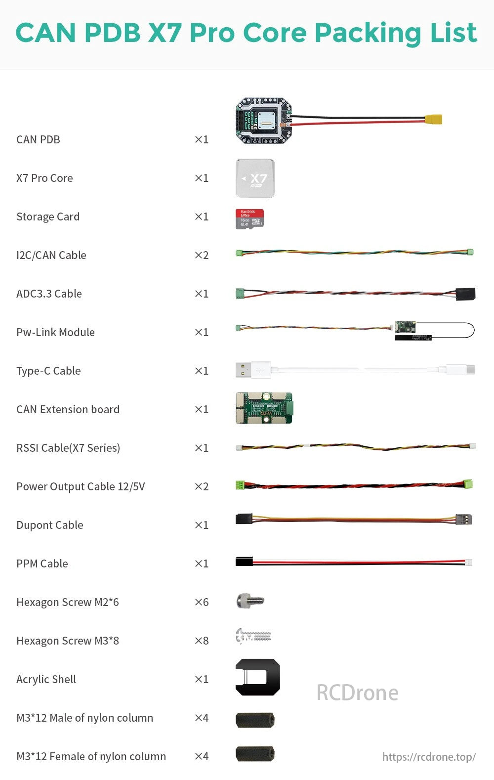 The package includes: CAN PDB, X7 Pro Core, XL storage card, one Exoisk I2C/CAN cable, two ADC 3.3 cables, one PW-Link module, and one Type-C cable. Additionally, you'll find six hexagon screws (M2*6) and eight hexagon screws (M3*8).