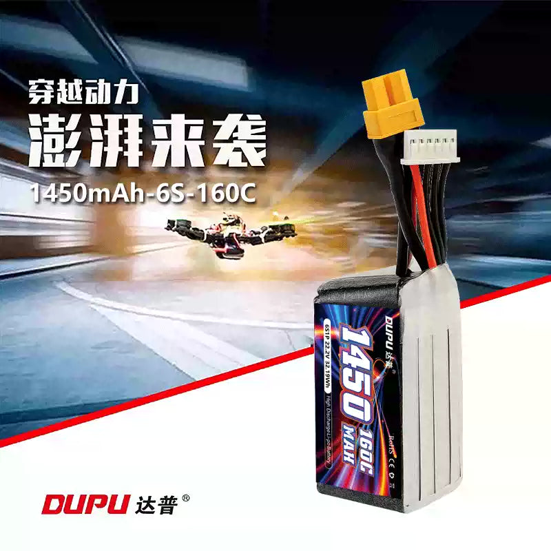 The DUPU 1400mAh and 1450mAh high-discharge LiPo battery series is designed to meet the demanding power requirements of FPV racing and freestyle drones. Available in 4S and 6S configurations with discharge rates up to 160C, these batteries provide instant throttle response, consistent output, and solid compatibility through the XT60 connector.