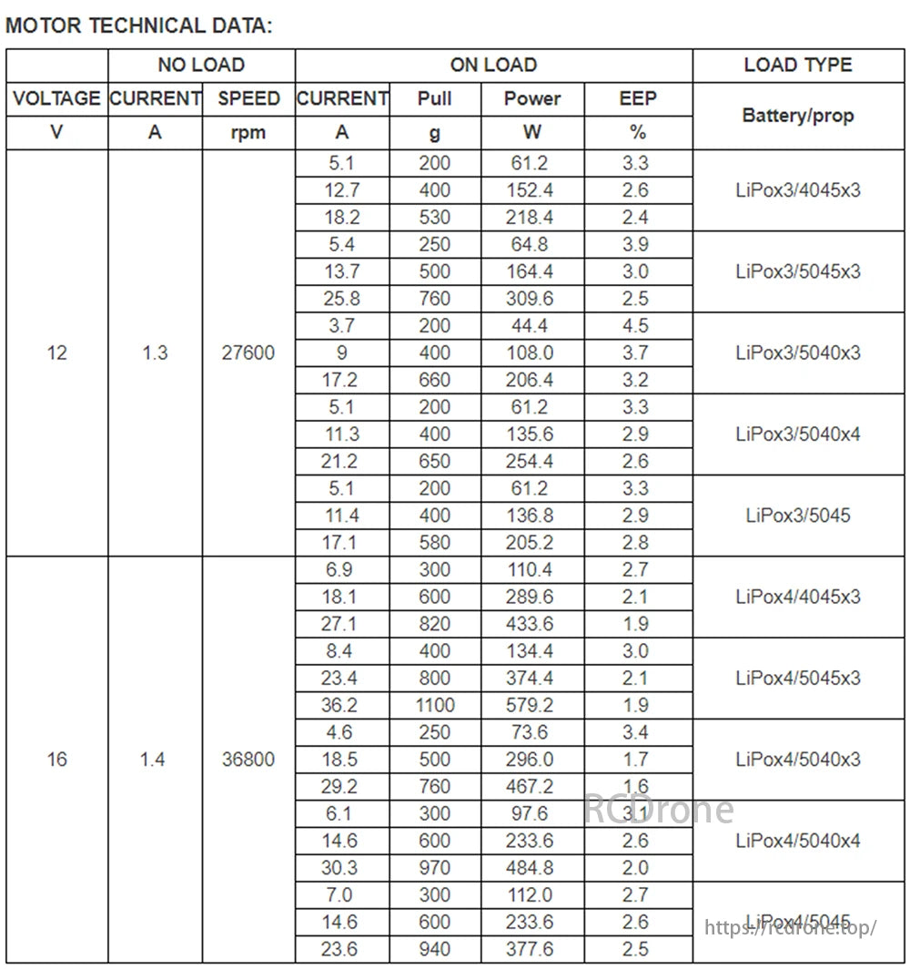 Motor data includes no-load/on-load specs for 12V/16V, covering current, speed, pull, power, and EEP percentages across different battery/prop configurations.