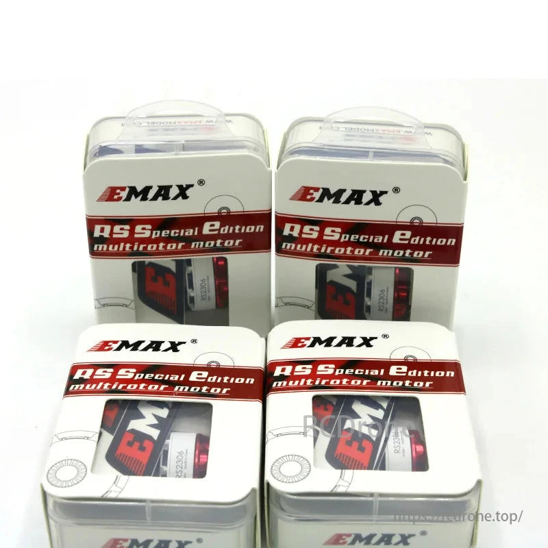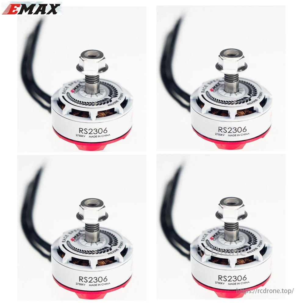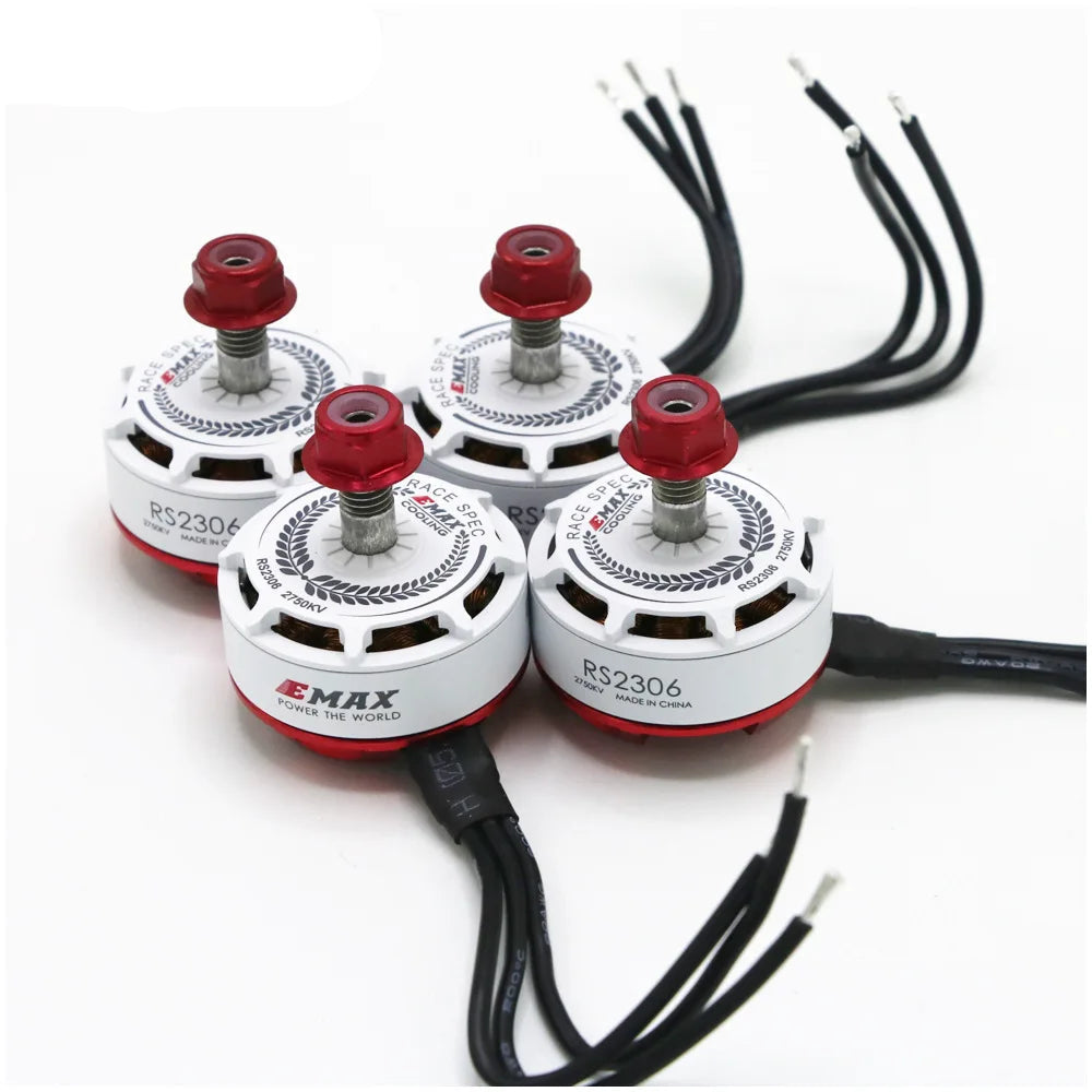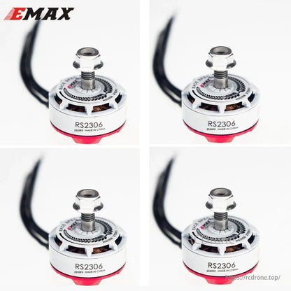 EMAX RS2306 2750KV brushless motor for 5-inch FPV racer quadcopter, made in China. Four identical units displayed.
