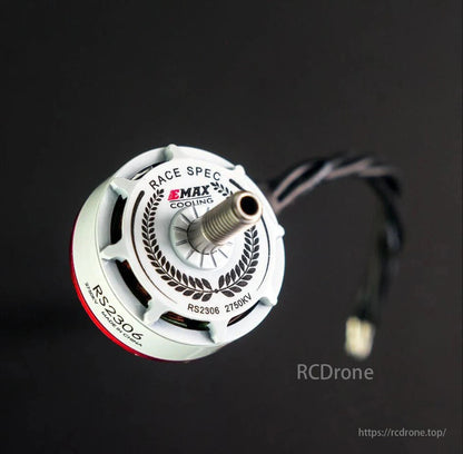 EMAX RS2306 brushless motor for 5-inch FPV racers. Available in 2400KV and 2750KV options, with max thrusts of 1552g and 1762g respectively. White limited edition initially offered.