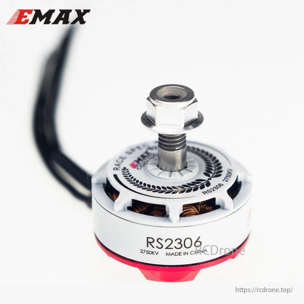 EMAX RS2306 2306 2750KV brushless motor for 5-inch FPV racer quadcopter, featuring red caps and black wires. Made in China.