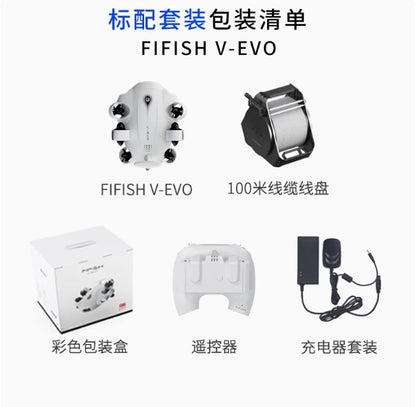 Included with the package is FIFISH V-EVO 10 Om tether reel, remote controller, and ROV charger.