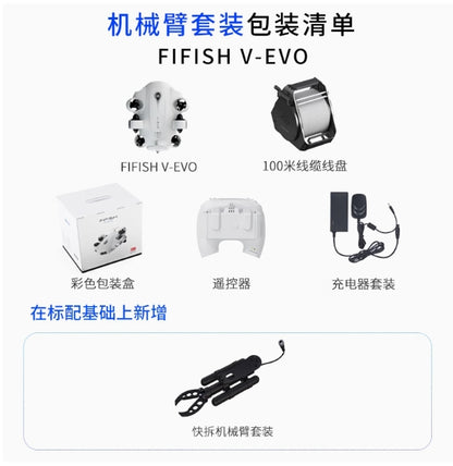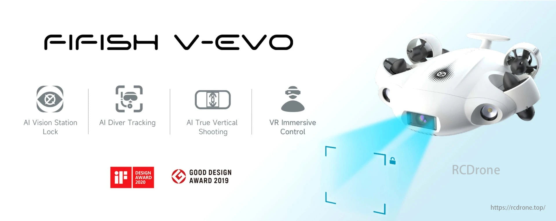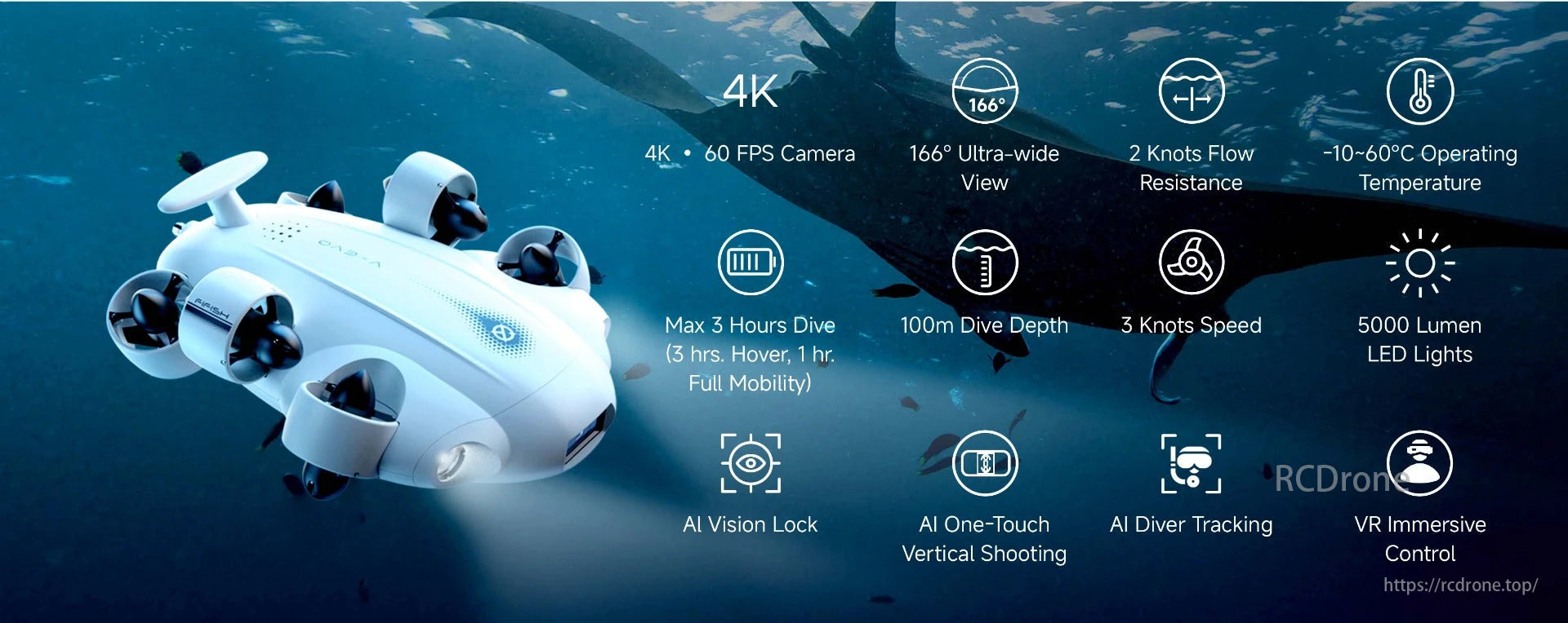 Underwater Drone FIFISH V-EVO offers 4K 60 FPS camera, 166° view, 2 knots flow resistance, -10~60°C operation, 3-hour dive, 100m depth, 3 knots speed, 5000 lumen lights, AI vision lock, one-touch vertical shooting, diver tracking, VR control.