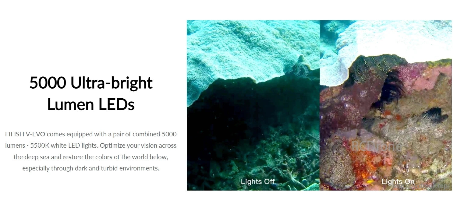 5000 Ultra-bright Lumen LEDs FIFISH V-EVO features a pair of combined 5000 lumen 5500K white LED lights, optimizing vision in deep sea environments with restored colors, even in dark and turbid waters.