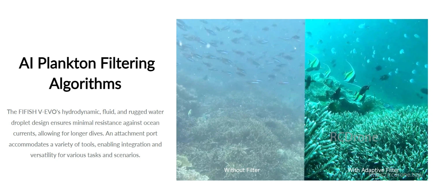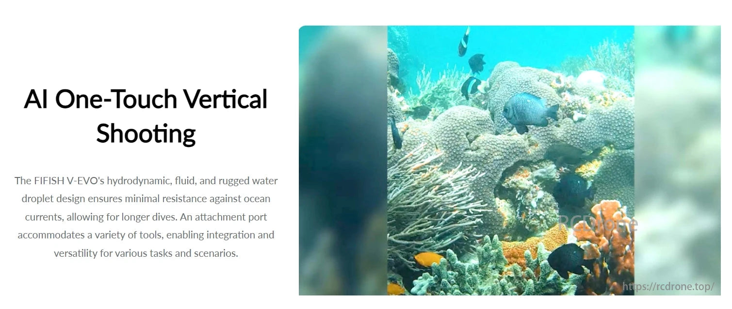 AI One-Touch Vertical Shooting. FIFISH V-EVO's hydrodynamic design ensures minimal resistance against ocean currents, allowing longer dives with versatile tool integration.