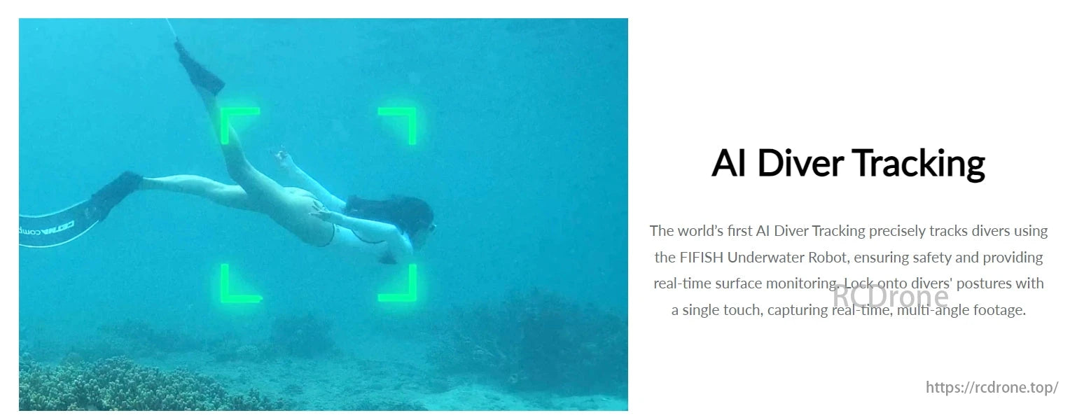 The Al Diver Tracking system uses the FIFISH Underwater Robot to precisely track divers, ensuring safety and real-time monitoring.