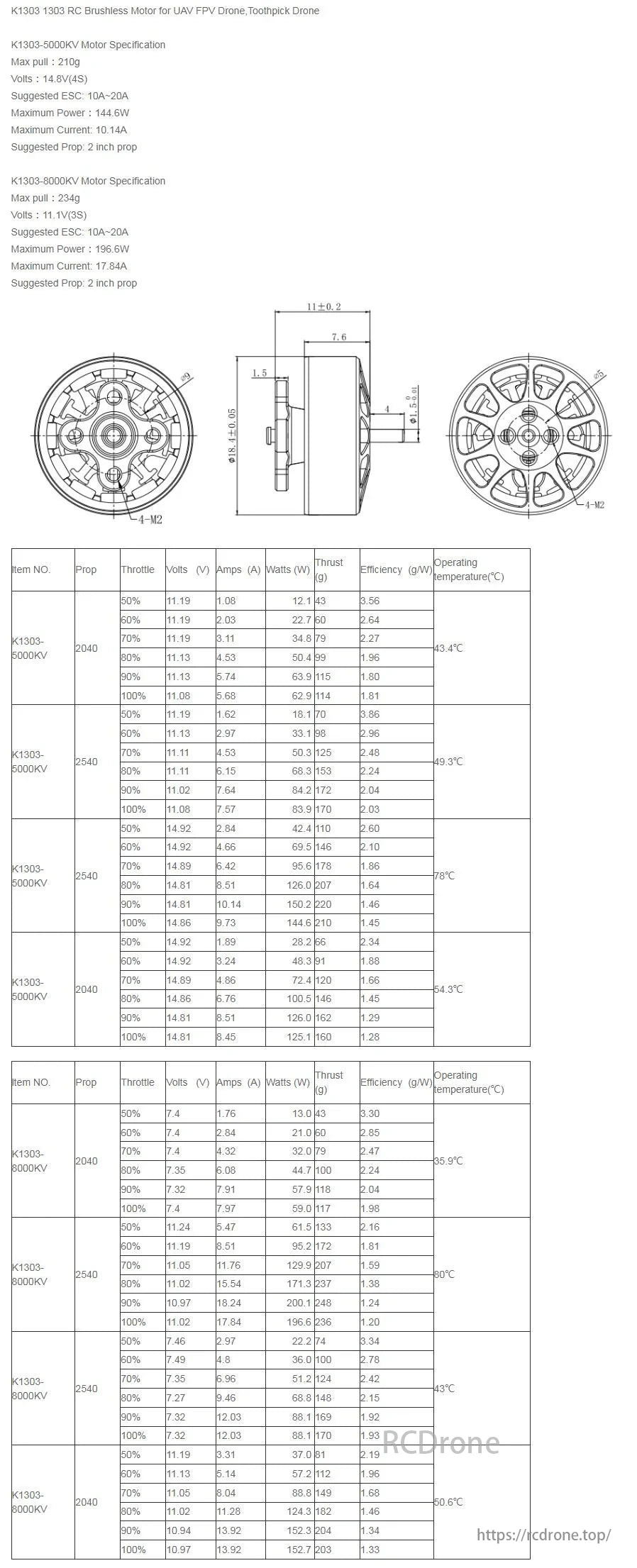 K1303 motor specs: 5000KV max pull 210g, 8000KV max pull 234g. Voltage, power, current, and prop suggestions provided. Performance data for various throttle settings and operating temperatures included.