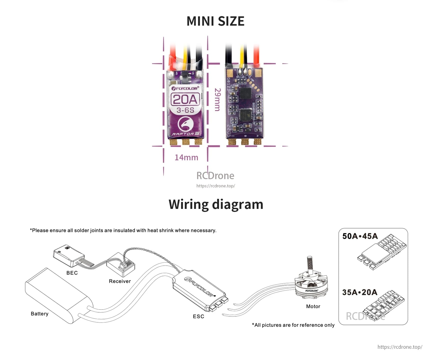Mini Size, Lightweight: From only 6.5g with compact size (29x14x6mm for 20A/35A, 33x16x6mm for 45A/50A).