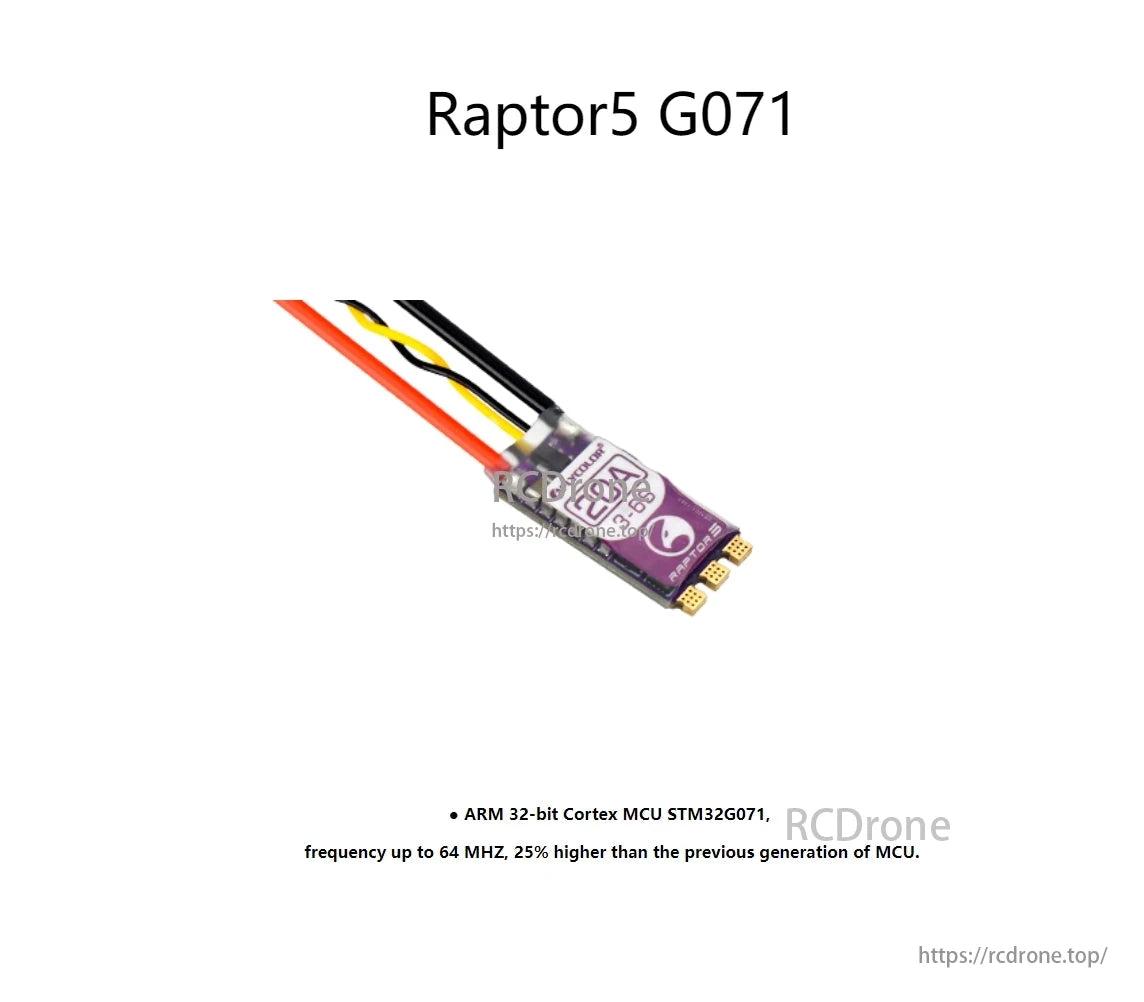 FlyColor Raptor5 FPV ESC uses high-performance ARM 32-bit Cortex MCU STM32G071, runs up to 64 MHz, 25% faster.