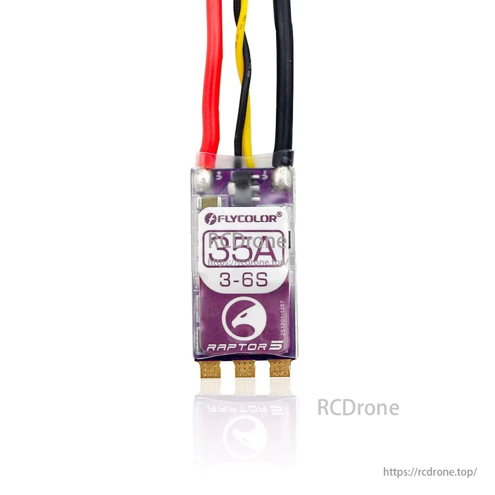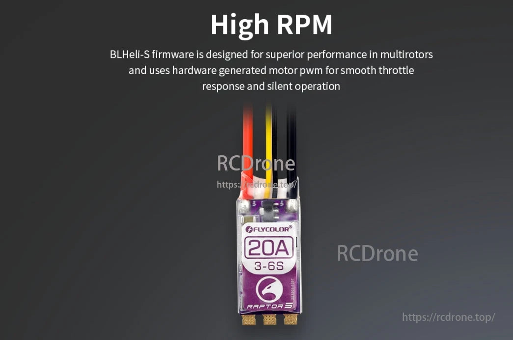 FlyColor Raptor5 FPV ESC, 20A, 3-6S. High RPM, BLHeli-S firmware for smooth throttle response and silent operation.