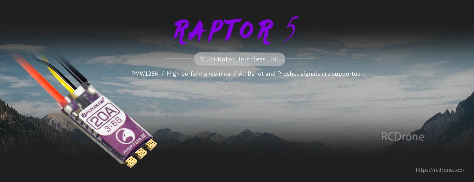 FlyColor Raptor5 FPV ESC supports 1-2ms pulse width, Oneshot125, Oneshot42, and Multishot. Automatic signal detection upon power up. 20A capacity, 3-6S battery support.