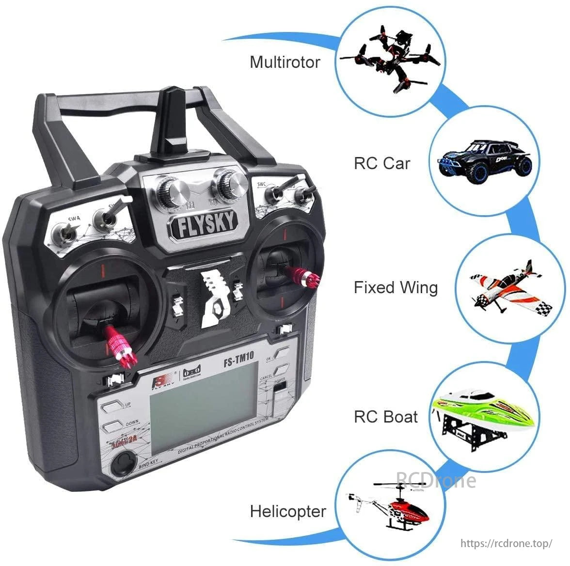 Compatible with multirotor, RC cars, fixed-wing aircraft, and RC boats. The FlySky FS-TM10 transmitter supports helicopters and features automatic frequency hopping, low-temperature alarm, bidirectional data return, and is powered by AA batteries.