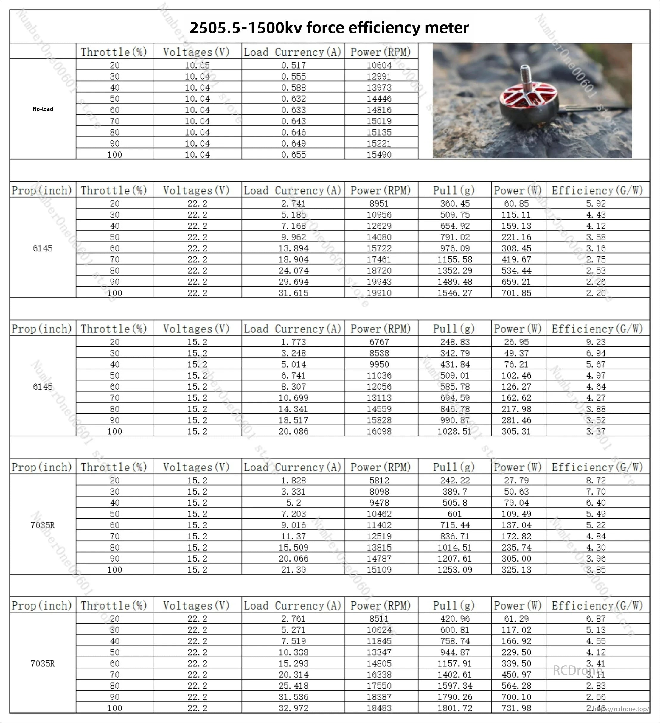 Force efficiency meter data for no-load, 6145 and 7035R props at various throttle percentages, including voltages, currents, RPM, pull, power, and efficiency values.