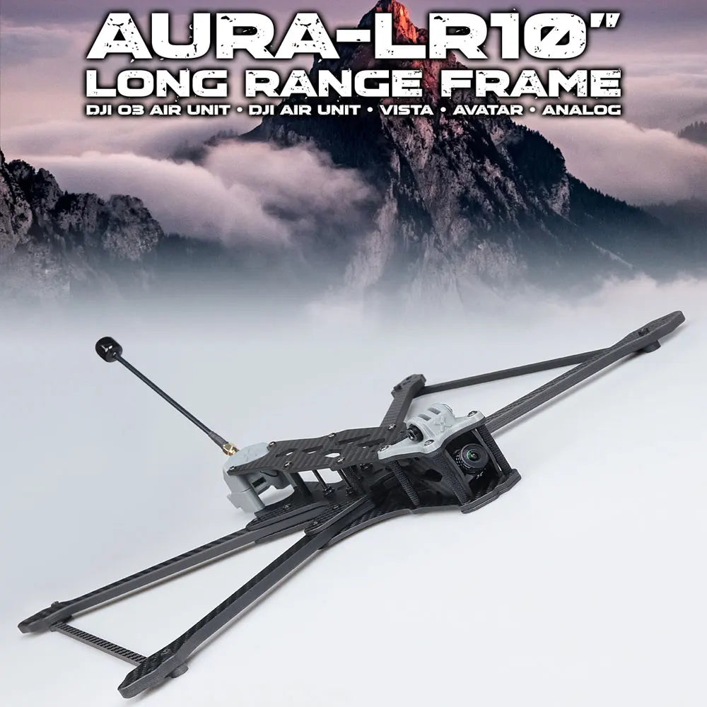 Foxeer Aura LR10 10inch FPV Frame, 440mm T700 Carbon with Silky Coating. Designed for Analog/O3/HDZero/Vista LR10 Drone. The frame features a durable and lightweight design, made from high-quality T700 carbon fiber with silky coating for reduced friction and improved durability.